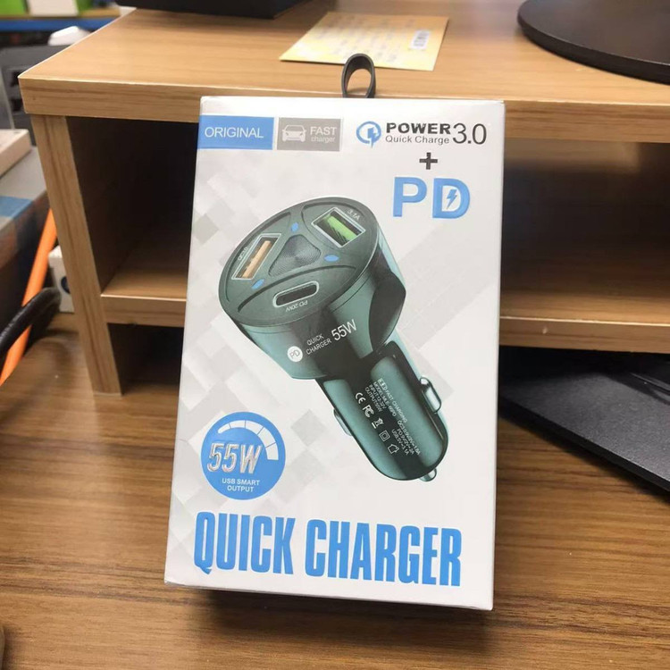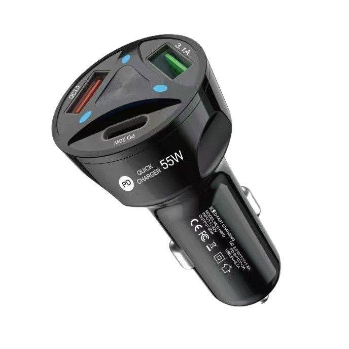 شارژر فندکی ۳ پورت ۵۵ وات فست شارژ QC3 با دو خروجی USB و یک خروجی PD